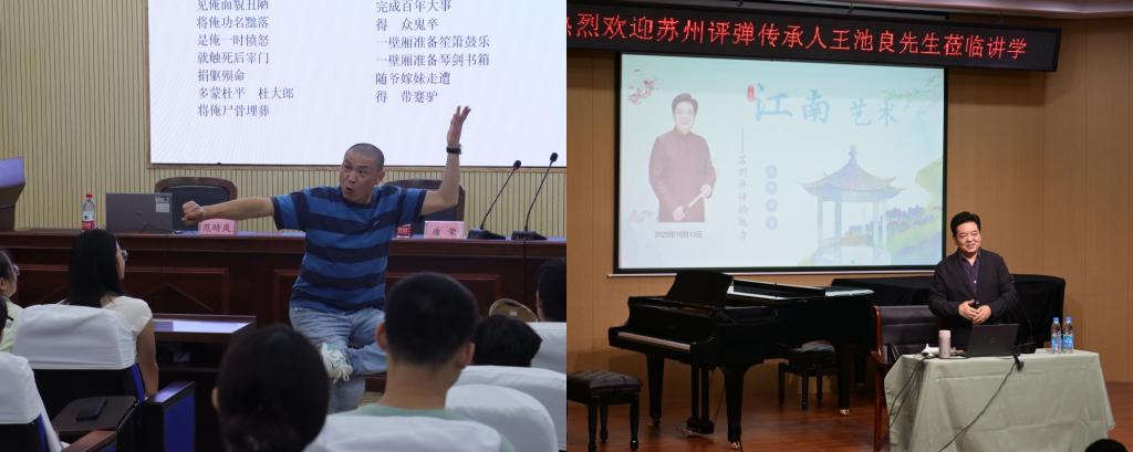 作为传承中华优秀传统文化、提升学生人文素养的重要平台,本次系列活动由校团委协同各承办单位精心策划、周密组织,以“名家+名曲”的经典模式有序推进。活动期间,主办方先后邀请苏州市昆剧院、锡剧团、滑稽剧团等专业院团的戏曲名家及高校优秀教师,在土木学院报告厅、音乐学院演播厅、文学院报告厅等场地,陆续开展“昆曲艺术之美与文化价值”“苏州评弹的魅力”“漫谈苏式滑稽”等多场主题授课。课程内容涵盖昆曲、评弹、滑稽戏等多个戏曲门类,有机融合知识讲授、表演展示与美学品鉴环节,构建了从“知戏”到“懂戏”再到“赏戏”的深度艺术引导体系,赢得师生广泛好评与热烈反响。