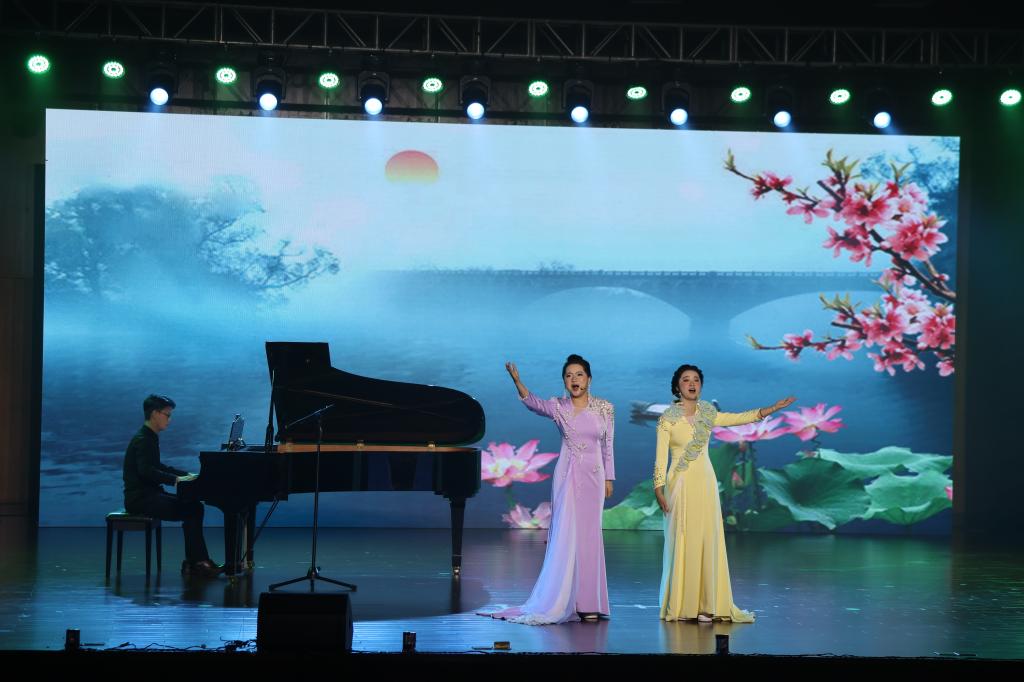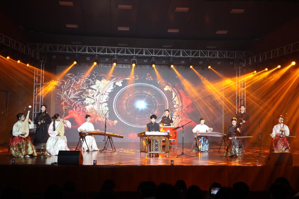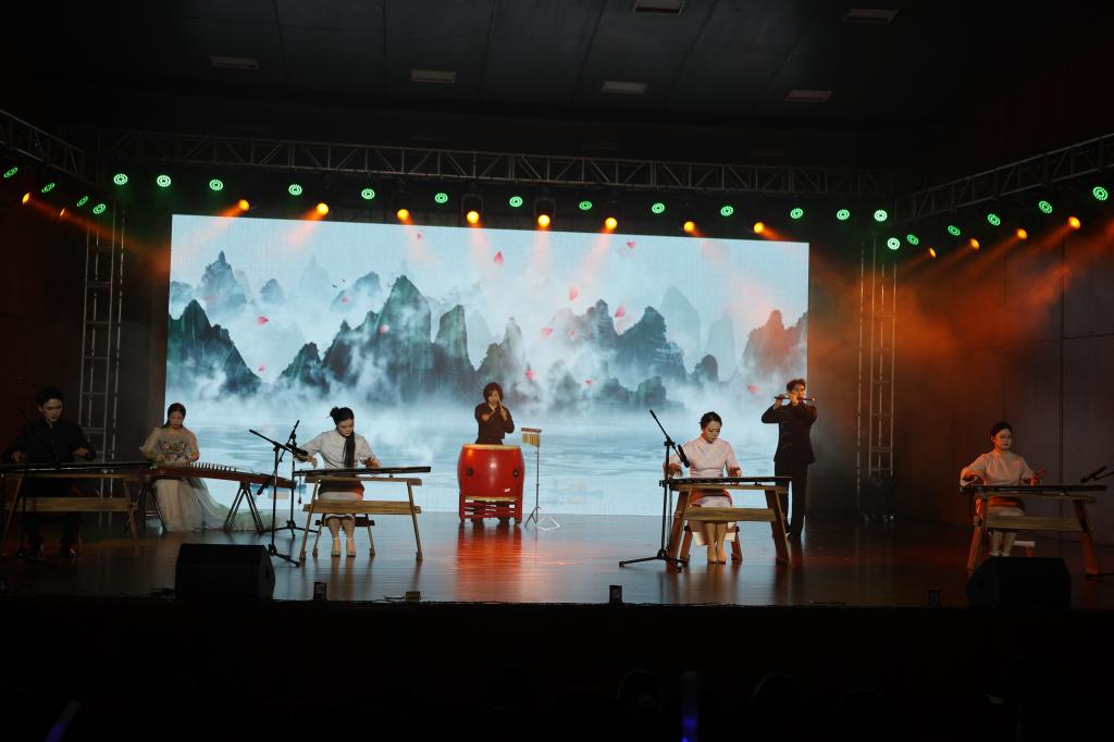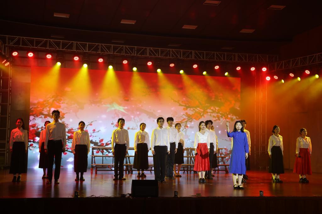 本场晚会分为“生生不息”“风华正茂”“锦绣华章”“同心同行”四大篇章,用多元艺术形式礼赞青春、共迎新年。晚会在校G-T街舞社活力四射的《舞启华章》中拉开序幕,动感舞步瞬间点燃现场氛围。关工委老师们带来的电吹管合奏《英雄赞歌》以激昂旋律致敬革命先烈,追溯历史荣光;对唱《声声慢》用婉转唱腔晕染诗意氛围;女子群舞《雨涧春行图》以灵动舞姿勾勒出江南春日的柔美画卷;女生二重唱《知道不知道》《螃蟹调》以民歌小调展现青春韵味,清甜的声线传递着青春意趣;情景表演《与信仰对话》用真挚演绎凝聚思想共识,诠释青年担当;古琴合奏《沧海一声笑》以琴、鼓、竹笛的交融,演绎出当代青年的洒脱与豪情;流行歌曲串烧《跨纪时光机》用经典旋律串联起不同年代青年的热血与梦想,唤醒共同的时代记忆;民乐合奏《盛世国乐》以磅礴乐章展现文化自信,以恢弘乐声颂扬国风雅韵;由音乐学院教师朱杰与校团委柴慎之老师带来的歌曲《春风十万里》,激昂而又温暖的曲调描绘了一幅春回大地、欣欣向荣的时代画卷;女子群舞《千里万里》生动展现了中华大地不同民族的文化风情,诠释了中华民族一家亲的深厚情感。晚会最后,歌舞表演《相亲相爱》将思念之情化为歌声,传递着温馨与祝福。