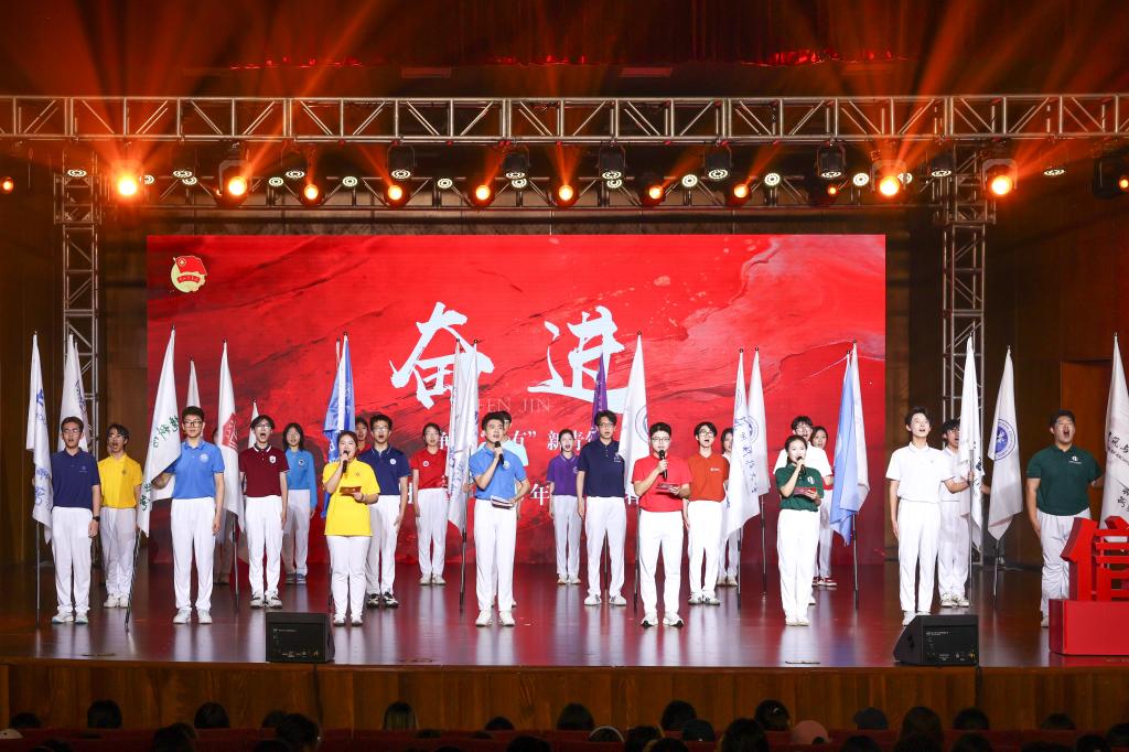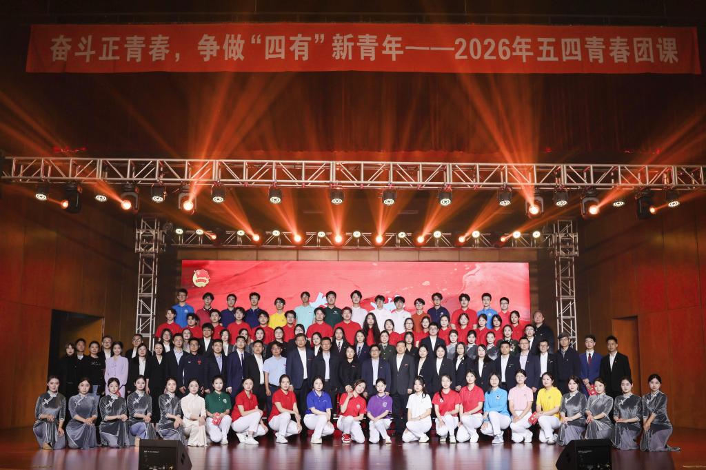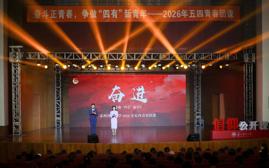 4月22日下午,我校“奋进”——2026年五四青春团课在石湖校区音乐厅隆重举行。校党委常委、副校长崔雪丽,团市委副书记龚迪,苏州科技馆运营管理有限公司总经理张鹏,学校相关职能部门负责人及600余名师生代表共赴这场青春盛会。